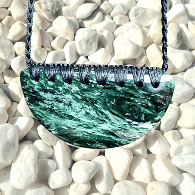 The Pounamu Breastplate is a powerful taonga symbolising mana, authority, protection, and strength. Traditionally worn by those of rank or responsibility, it is a statement piece carrying deep presence and grounding energy.