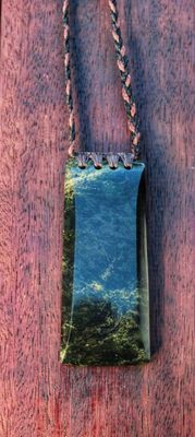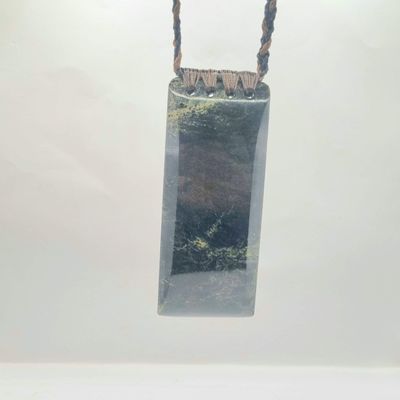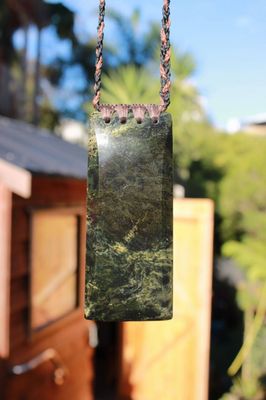 Comes with a brown and black plaited adjustable cord in a Kete bag
